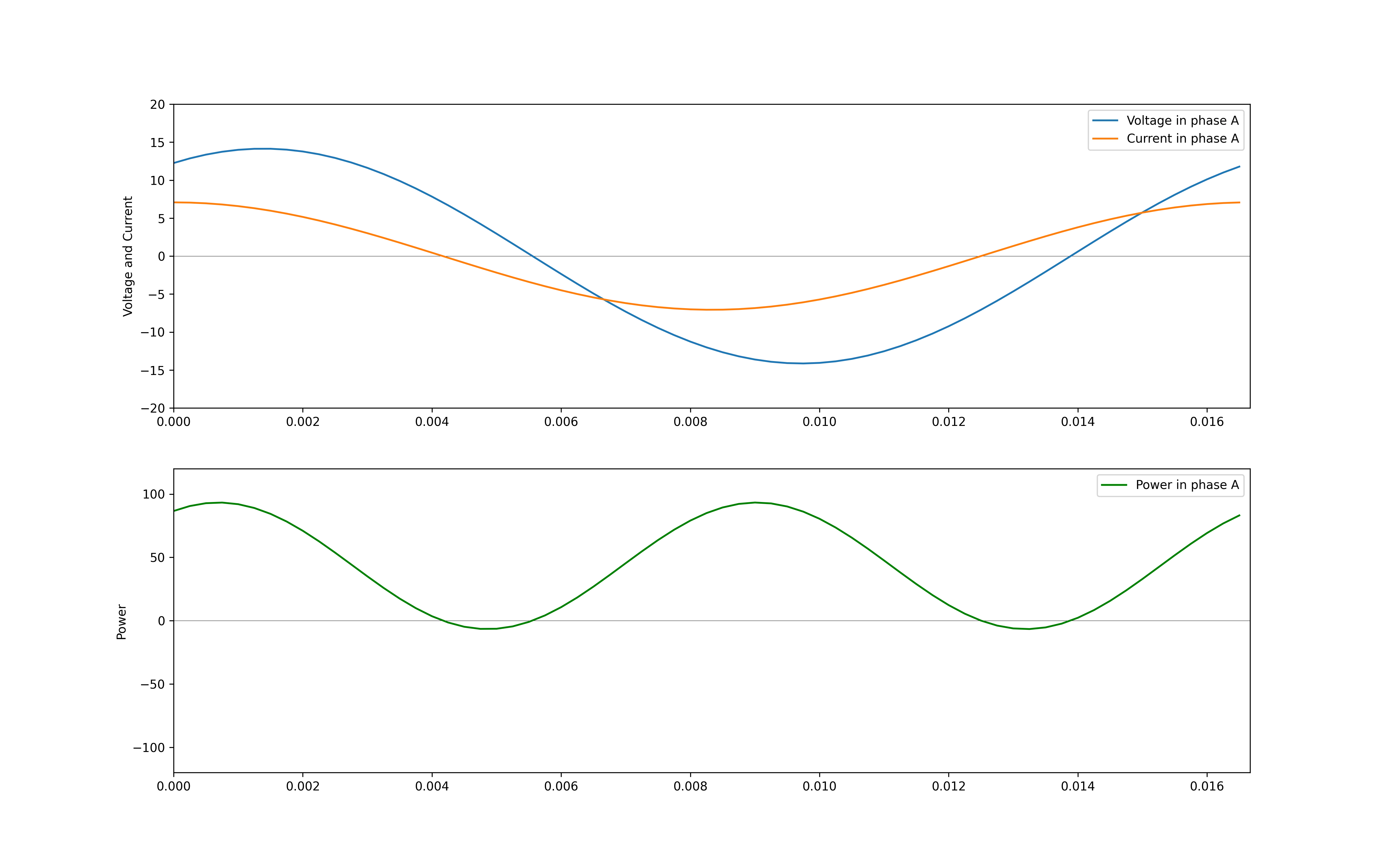 # ax1.plot(t, v, label = 'Voltage in phase A')# ax1.plot(t, i, label = 'Current in phase A')# ax1.set_ylabel('Voltage and Current')