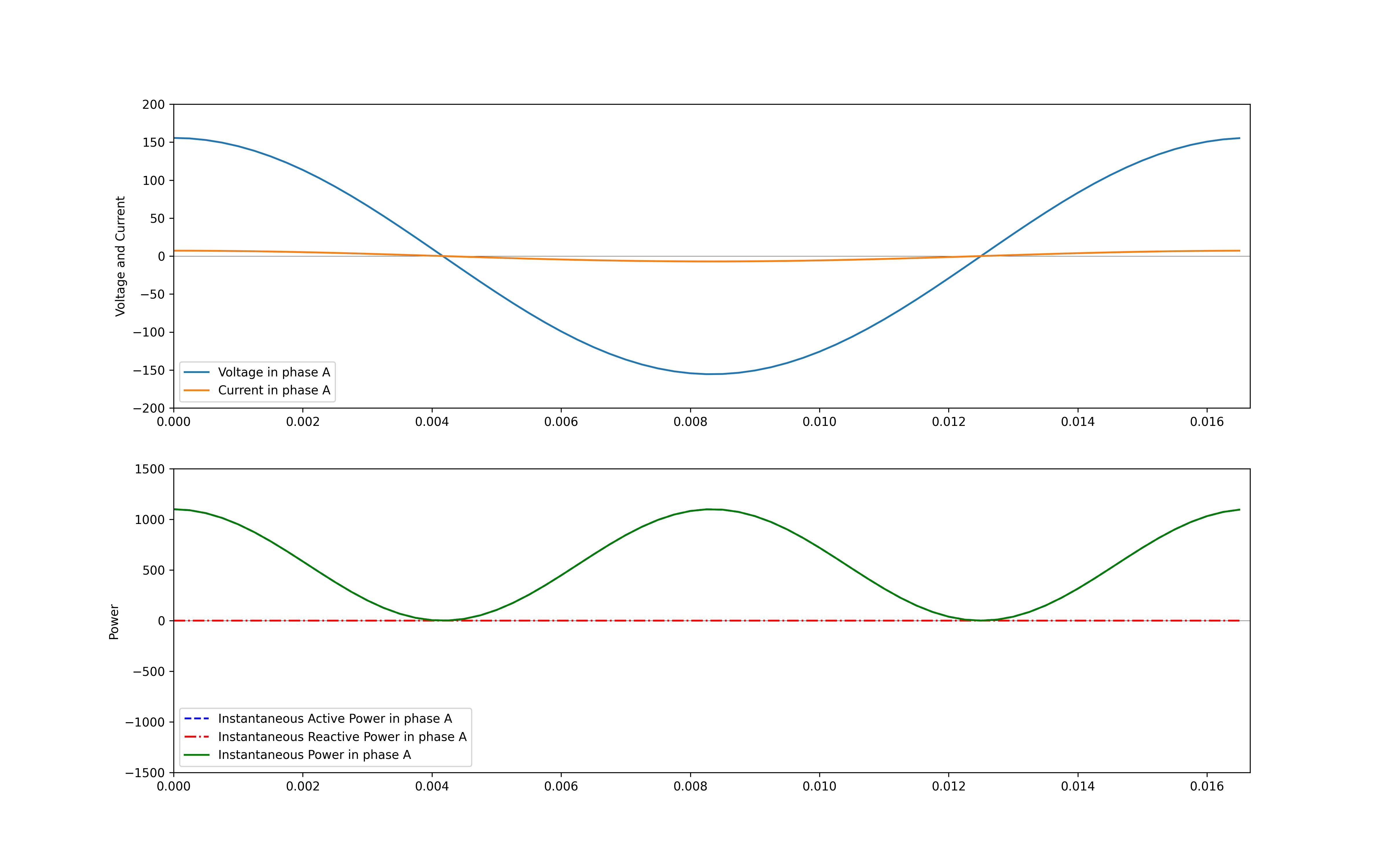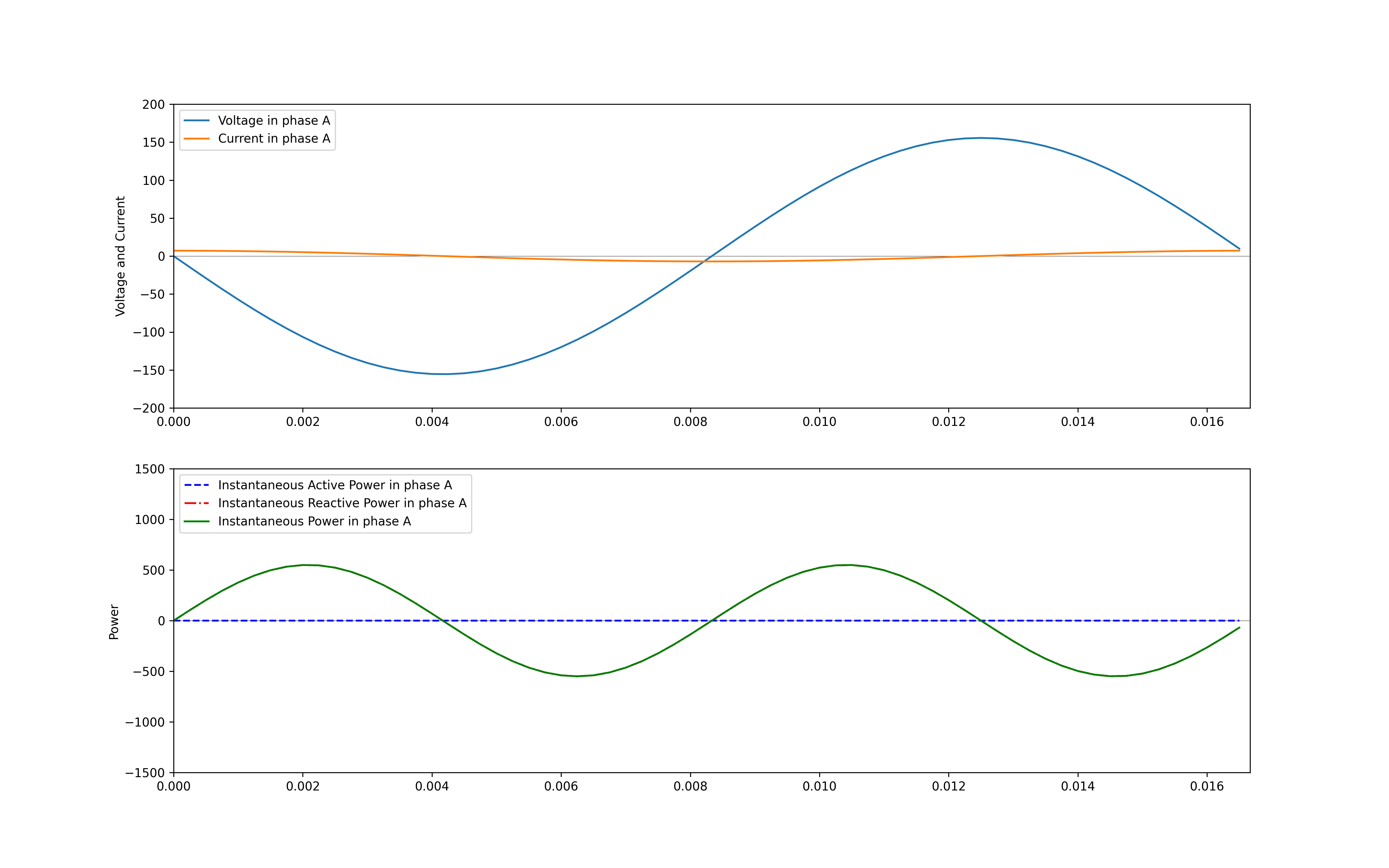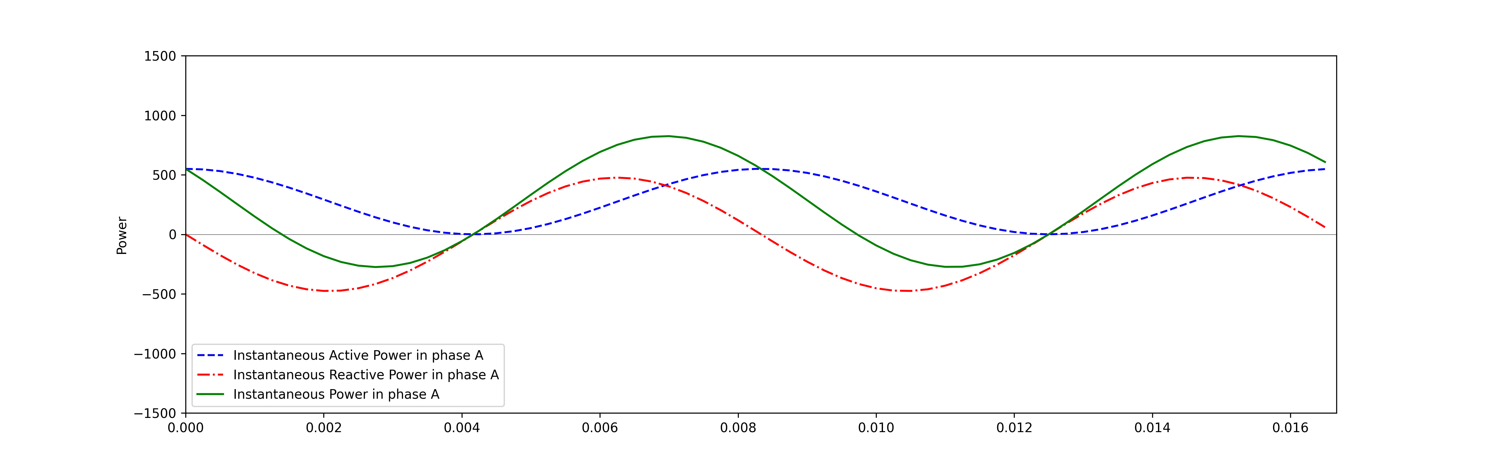 ax2.plot(t, p_R, label = 'Instantaneous Active Power in phase A', linestyle='--', color = 'b')ax2.plot(t, p_X, label = 'Instantaneous Reactive Power in phase A', linestyle='-.', color = 'r')