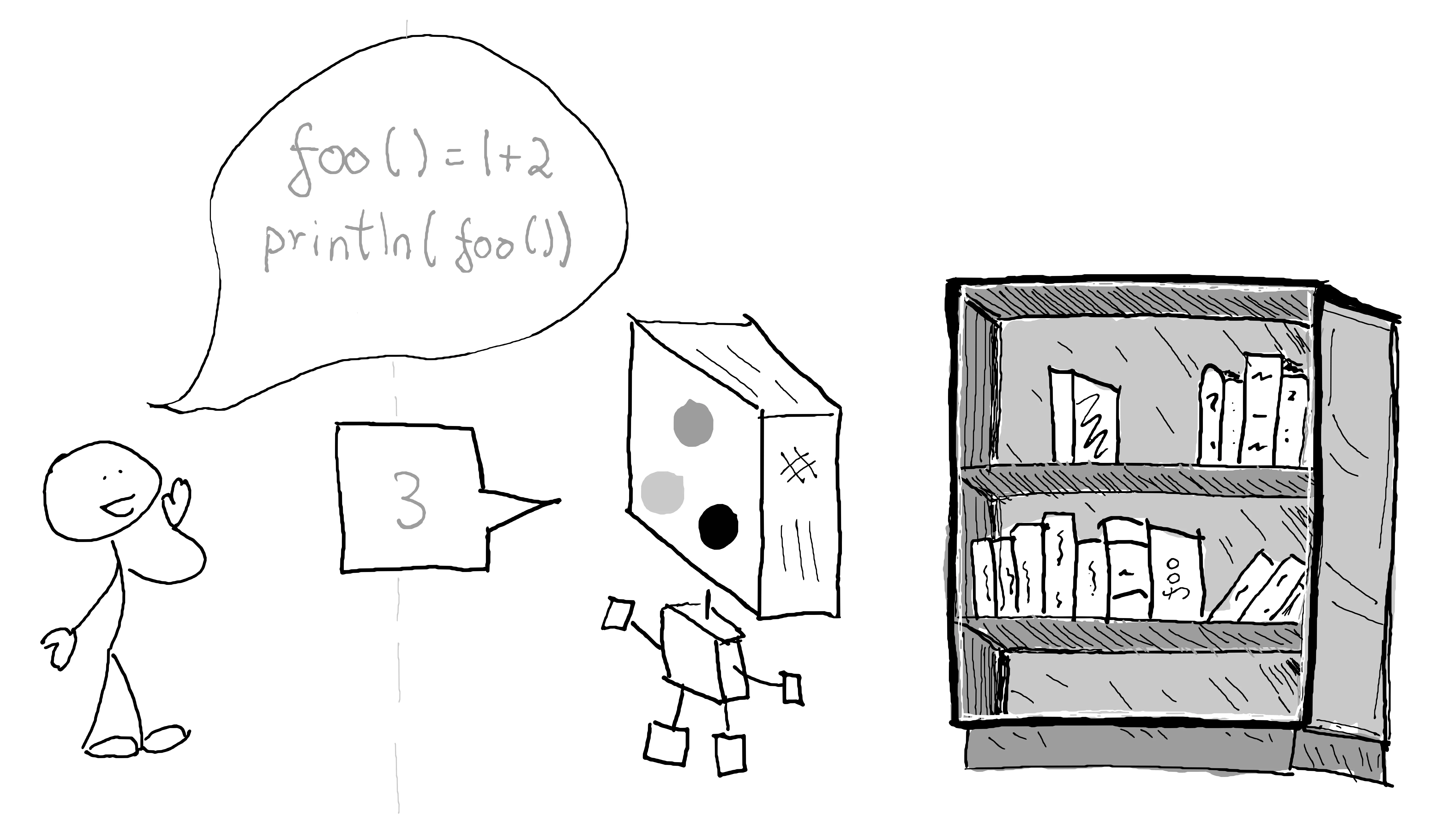 To interact with the bookshelf (i.e., the program's memory), the Julia language, as part of its vocabulary, provides you with functions and variables among other things.