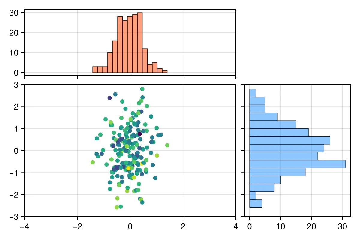 Random.seed!(123)n = 200x, y, color = randn(n) / 2, randn(n), randn(n)fig = Figure(size=(600, 400))ax1 = Axis(fig[1, 1])ax2 = Axis(fig[2, 1])ax3 = Axis(fig[2, 2])hist!(ax1, x; color=(:orangered, 0.5), strokewidth=0.5)scatter!(ax2, x, y; color=color, markersize=10, strokewidth=0)hist!(ax3, y; direction=:x, color=(:dodgerblue, 0.5), strokewidth=0.5)xlims!(ax1, -4, 4)limits!(ax2, -4, 4, -3, 3)ylims!(ax3, -3, 3)hideydecorations!(ax3, ticks=false, grid=false)hidexdecorations!(ax1, ticks=false, grid=false)colsize!(fig.layout, 1, Relative(2 / 3))rowsize!(fig.layout, 1, Relative(1 / 3))colgap!(fig.layout, 10)rowgap!(fig.layout, 10)current_figure()